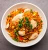 Two beautifully plated dishes: on the left, tender grilled chicken with vibrant orange sauce and garnish; on the right, classic spaghetti in tomato sauce topped with grated cheese and herbs.